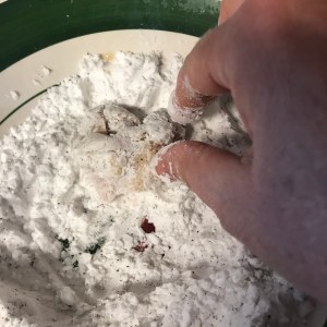 While your oil is heating up, mix your dry ingredients in a bowl for the coating. Take your marinaded chicken and coat each piece with the coating and place on your rack over cookie sheet (or countertop).